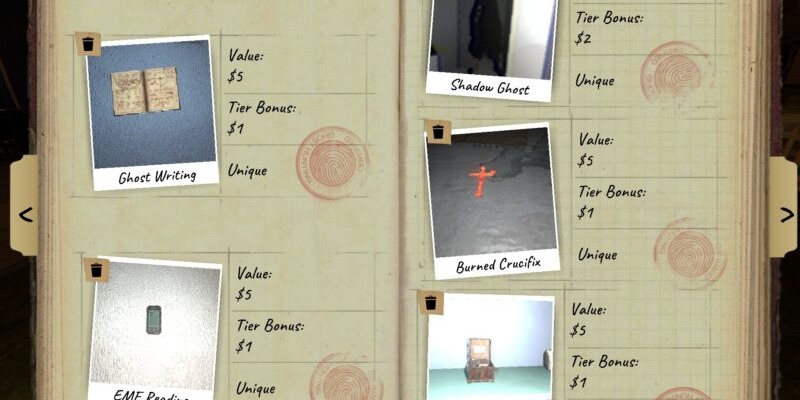 PhasmophobiaIn addition to these features, the Journal will be completely reworked. The "Photos" tab will be replaced by a "Media" tab, where images, videos, and audio recordings will be stored. The update will make it easier to store and fetch gathered evidence. The rewards and achievements system will also undergo significant changes: the first gathering of evidence will be designated as "Unique" and provide more XP and money, while the same evidence collected in turn will provide less.